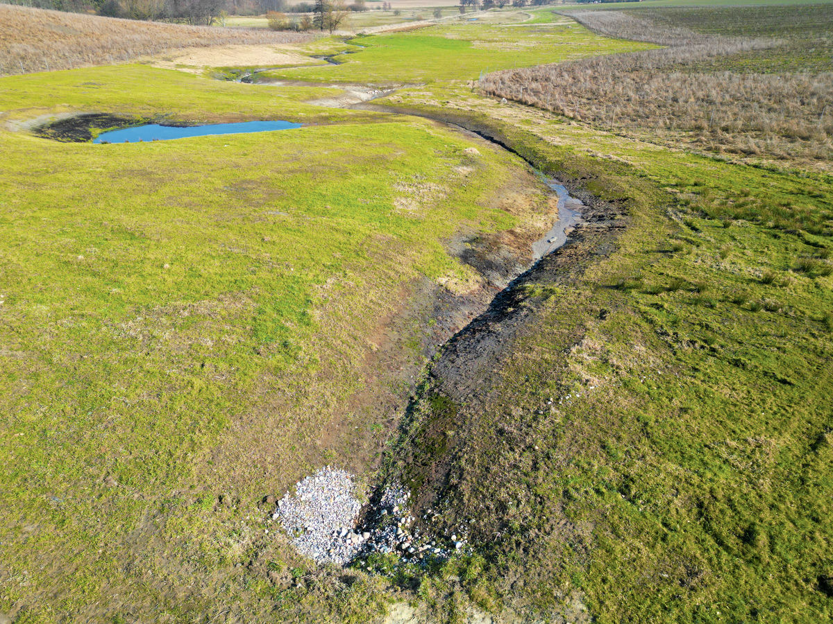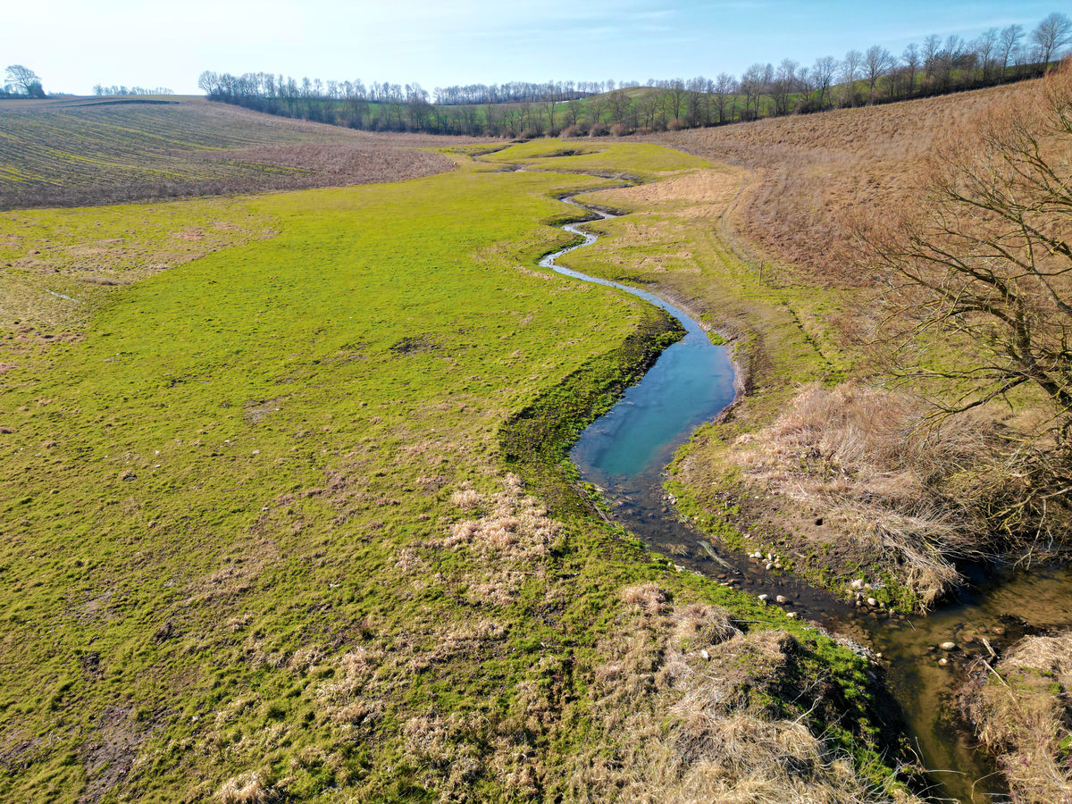 Et gammelt hoveddræn er gravet op, og i stedet har vi skabt et åbent vandløb, der slynger sig naturligt gennem landskabet.