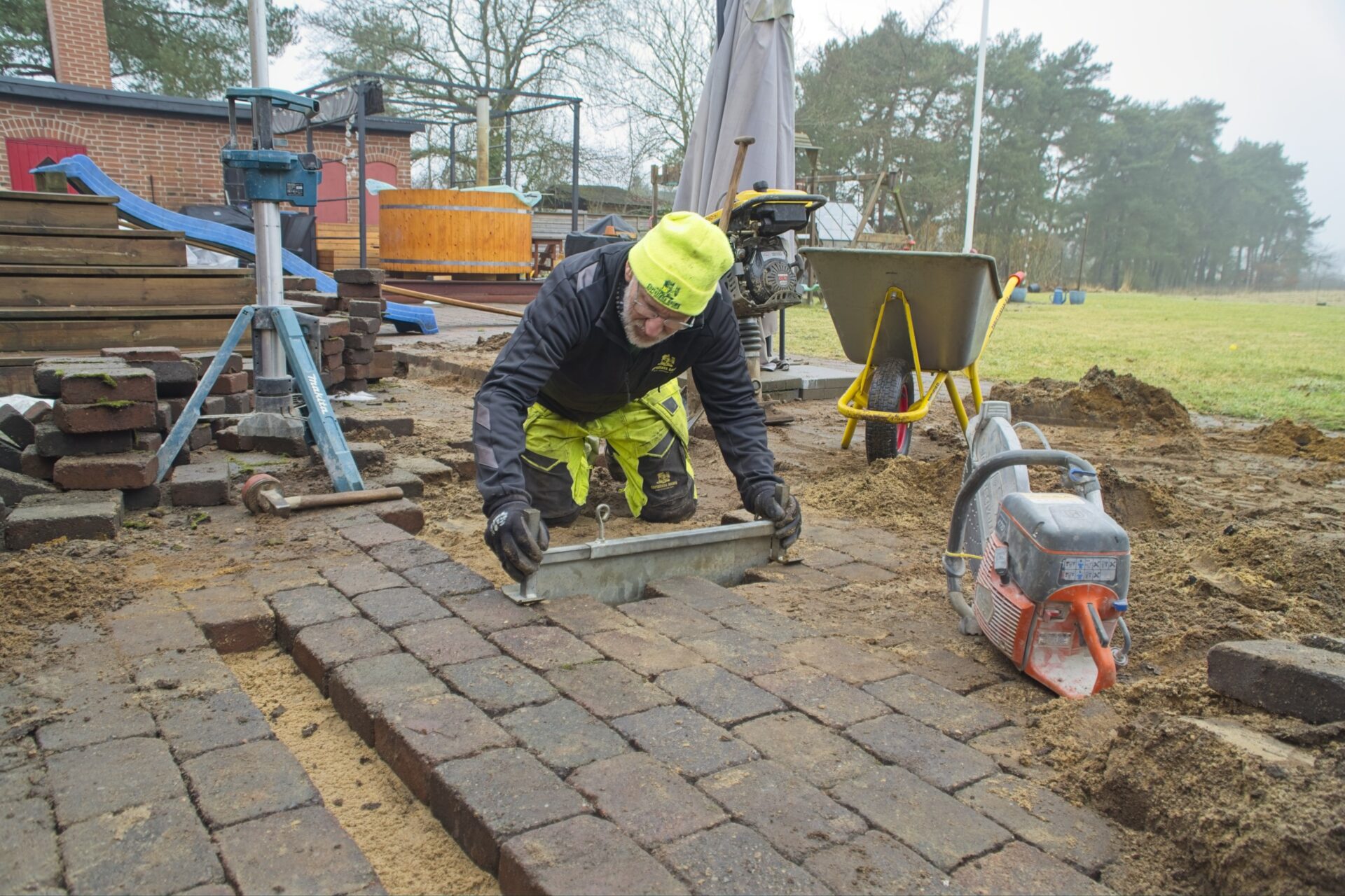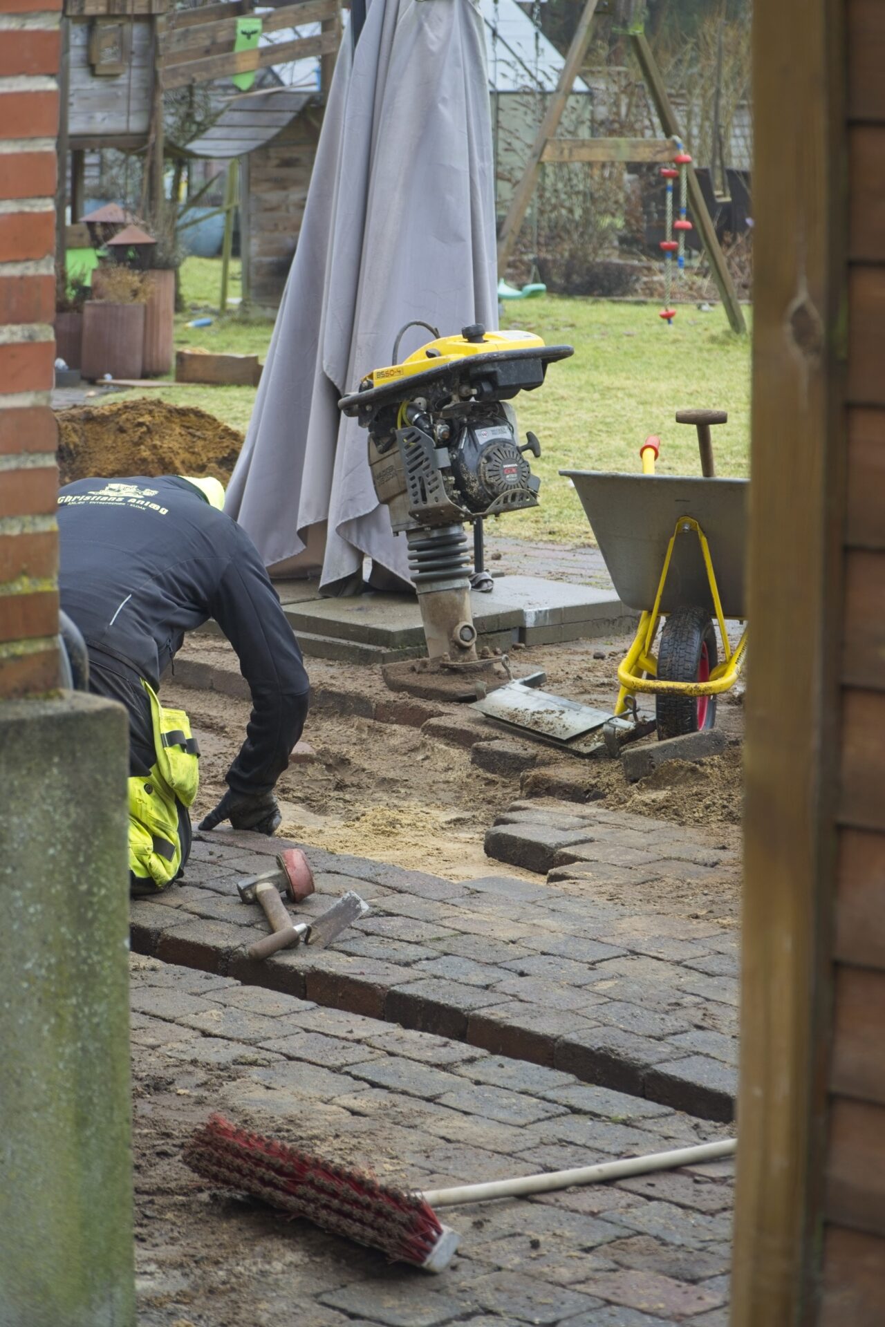 Tom og Jan er i fuld gang med at sløjfe en gammel septiktank og koble til den nye pumpebrønd. Når brønd og rør er på plads, lægger vi naturligvis fliserne pænt igen. Det skal se ordentligt ud, når vi kører.