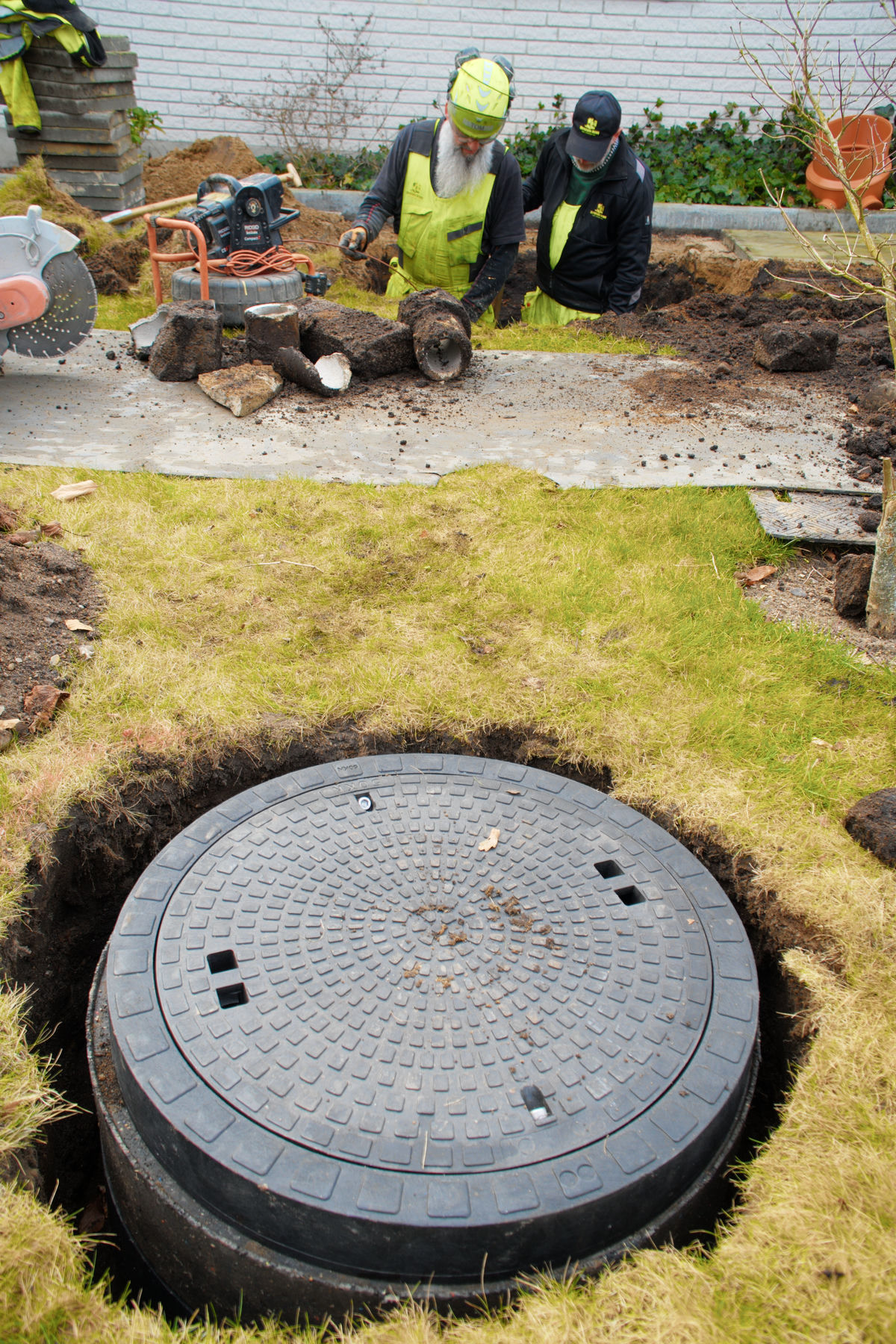Det eksisterende brønddæksel på skelbrønden bliver hævet og udskiftet, og der monteres rottespærre – så der er ro i maven mange år frem.